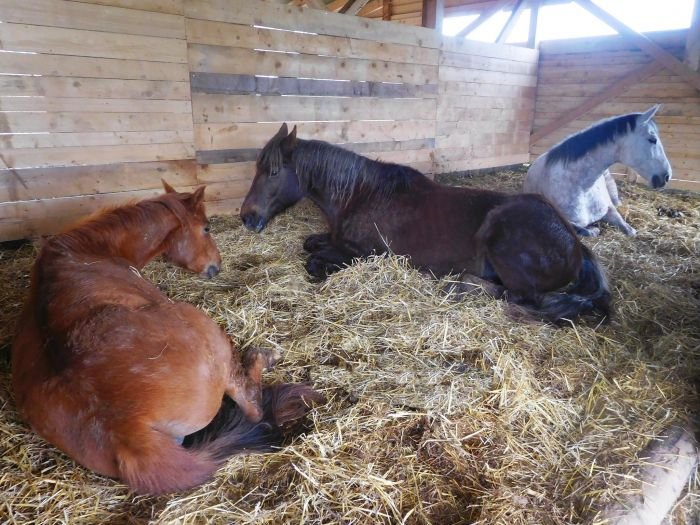 Zázemí pro koně tu sice žádné nebylo, ale chuť do práce nám nescházela. Uzpůsobili jsme stodolu, postavili ohradu a přestěhovali si oba koníky. Začínali jsme v zimě s tím, že koně měli z půlhektarové ohrady přístup do části stodoly (v druhé půlce bylo seno, cajky…). Na jaře jsme ohradili pastvinu (z části je naše, část máme na pronajatém). V té době přišla kamarádka, jestli by si k nám nemohla dát koníka… a po chvíli druhá… Trávy bylo dost, koně nestíhali spásat, další koňští kámoši pro ty stávající by byli přínosem, takže jsme vždy se slovy: „Jestli dva nebo tři koně… tři nebo čtyři koně….“ kývli.
