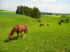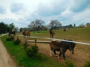 Nyní tu tedy máme své dva velké koně + poníka a dalších deset koníků na ustájení (nejmladšímu je rok, nejstaršímu 23…). Majitelé si platí ustájení, veškerou práci kolem koníků obstarávám já, manžel buduje a pracuje s technikou. Koně mají k dispozici necelých 5 ha pastvin s lesíkem, 3 prostorné přístřešky a 1 hliněnou ohradu bez trávy. Máme je totiž rozdělené do dvou stádeček – normální koníci + „hubeňouři“ (tedy ti, co se můžou ládovat neomezeně) a druhé stádečko tvoří „tlusťouši“ + poníci po schvácení + mladý hřebeček.