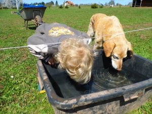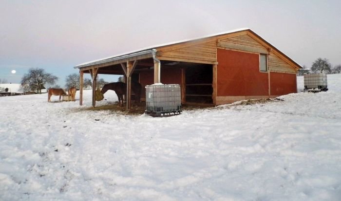 Jedna ohrada je hned u baráku, takže vanu napouštím hadicí přímo z domu. Na druhou pastvinu vozíme vodu v 1000litrové nádrži traktůrkem, z té pak napouštíme do dvou zednických kalfasů. V zimě pak dopouštím několikrát denně. Když to jde, tak hadicí, jinak v kbelíkách, na vzdálenější pastvinu v 80l vaku na kolečku. Když je potřeba, donesu v kbelíkách teplou vodu z koupelny. V plánu je zprovoznit studnu, která je přímo na pastvině u přístřešků (bývalí majitelé ji bohužel zasypali sutí).