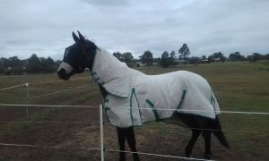 Dekování jsem už popsala výše. Jinak používáme masky, mícháme si svůj vlastní repelent (tea tree oil, eucalyptus oil a pak je tu produkt permoxin, kterého stačí 5 ml na půl litru vody, vše smíchat), a také mažeme opalovacím krémem nebo zinkovou mastí, hlavně koně, kteří mají bílé odznaky na hlavách nebo nohou.