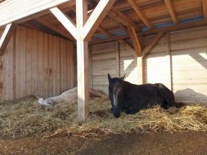 Nastýláte koním? Kam?Přístřešky nastýláme slámou, především v chladnější části roku, častěji než v přístřešku však koně většinou přistihneme lehávat jinde a nastlaná místa využívají jako záchody.