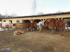 Přístřešky máme dva. První z nich jsme vybudovali na místě, o kterém jsme si MYSLELI, že bude to pravé a dokonale vhodné 🙂 – a ten druhý jsme budovali po pár letech a několika koních navíc již na místě, které se LÍBILO JIM… 🙂 Oba jsou dřevěné – starší 7 x 4 m a novější 12 x 3 m.