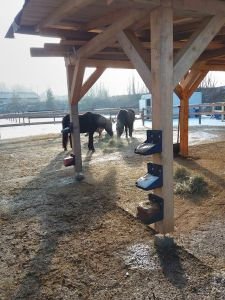 Jaký systém krmení senem se vám osvědčil?Kromě několika dnů v roce, kdy opravdu nepřetržitě proprší celé dny i noci, se snažíme koním seno rozvážet po celém areálu, všude tam, kde to aktuální podmínky dovolí. Nejsme líní vyvážet seno na kolečku ani do kopečků nebo do hůře přístupných míst. Při nepřízni počasí rozdáváme seno pouze na místa se zpevněným povrchem plus plníme sítě umístěné v přístřešcích.