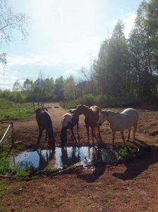 Terén v našem paddocku je hodně členitý, takže koně mají kromě pískoviště na válení k dispozici širokou škálu různých stromů a keřů, o které se rádi podrbou. Jeden z treků je přepažen brodem, ze kterého koně často a rádi pijí. Na dalším místě vyvěrá menší pramen, který však většinou přes léto vysychá a vytváří koňmi velmi milované (námi už méně :-D) bahniště. Shrnula bych to jako „hodně zábavy v přirozeném duchu“. 🙂