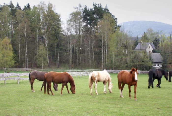 1. Jak byste charakterizovali své ustájení, kolika koním slouží, jak dlouho je v provozu?Preferujeme pastevní ustájení v režimu 24/7. Venkovní ustájení se nám po zkušenostech prostě osvědčilo (jak z hlediska zdravotního, tak psychického) – určitě ho neprovozujeme z důvodů absence boxů. Pohodu koní zajišťujeme (na to opravdu velmi dbáme!) rozdělením stáda do menších skupin podle vzájemné snášenlivosti jednotlivých koní. Jen pohodové stádo, ve kterém jsou si členové vzájemně nakloněni, může dlouhodobě prosperovat. Navíc jsou potom koně pod sedlem vyrovnanější, "nevymýšlí" ani po delší jezdecké přestávce. Venkovní chov pomohl i klientským koním u nás – například sem přivezli dýchavičnou, velmi hubenou kobylku QH, která mnoho času trávila v boxovém režimu. Po přesunu k nám do pastevního ustájení a po začlenění do vyhovujícího stáda, s kvalitním bezprašným a bezplísňovým senem, se její zdravotní stav velmi zlepšil, krásně přibrala, dýchavičnost téměř zmizela – projevuje se jen při velmi teplém počasí a špatně zvoleném povrchu při vyjíždce. I léta boxovaný plňásek se postupně velmi dobře aklimatizoval na venkovní režim bez potřeby dekovat, naopak to zdraví koníka utužilo a zlepšilo (čemuž dopomohly i zdejší kopcovité pastviny). Hřebce máme v současnosti 3, jejich počet ale není stálý. Bývají ve stádě spolu, tvoří čistě hřebčí skupinku, bez valachů. Neseparujeme je, dbáme na sociální vyžití a spokojenost všech zvířat u nás. Hřebci jsou k lidem kontaktní, navzájem se dobře snáší a tím, že mají kobyly denně na dohled, je tolik neřeší – na rozdíl od hřebců, kteří jsou v jiných stájích přísně izolováni na samotkách tak, aby klisny pokud možno ani nezahlédli. V současné době zde máme 15 koní, kapacita ranče je až 30 koní. Ve stávající podobě jsme v provozu 13 let.
