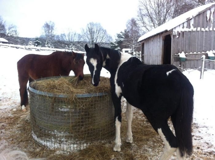 6. Jaký systém krmení senem se vám osvědčil?Senem přikrmujeme od konce září, října. Záleží na aktuálním počtu koní, s čímž souvisí stav porostu v pastvinách – zda plochy stíhají koně uživit, nebo je už příkrm nutný. Pokud začneme přidávat seno, jedeme v systému "celý balík v kovové skruži, přístup neomezen". Hlavně přes zimu a namáhavá období (vlhko, chlad, větry) chceme využívat faktu, že fermentací vlákniny ve střevech se koně přirozeně udržují v teple.