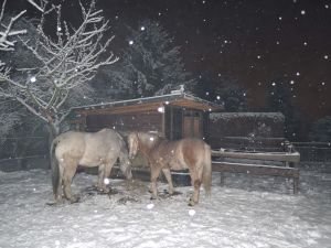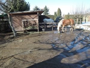 A i letošní sněhová zima nám jen potvrdila, že jsme udělali dobře. Návaly sněhu jsme asi po tři dny odklízeli prohrnovákem, na udusaném tvrdém sněhu se koníci neklouzali, problém nastal při oblevě jen minimální, kdy snad jen na jeden den se vytvořily malé plochy s ledem – ty jsme posypali popelem z dřeva z krbovek. S úsměvem musím potvrdit, že prakticky celou zimu i při oblevě jsem mohla chodit krmit v kroksech, narozdíl od pastevního ustájení, kde mi bláto hned na kraji ohrady sežralo gumáky. A kluci jsou neustále krásně čistí, bez nánosů bahna. Takže když si i při té největší oblevě vzpomenu, že se půjde jezdit, můžeme vyjet během pár minut.