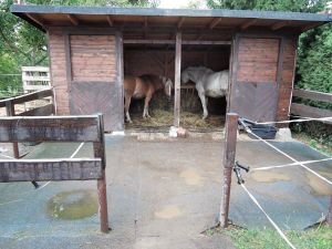 2. Máte k dispozici i boxy? Pokud ano, jak často je využíváte?Ustájení jsme vybudovali na zahradě u domu. Na betonových patkách manžel postavil box o rozměru 6 x 3 m, který jde přepažit na 2 samostatné boxy. Před ním je pevná dřevěná ohrada také 6 x 3 m. Slouží k oddělení koní a k tomu, aby nemuseli být zavřeni přímo v boxu. Zde tvoří podlahu gumové pásy. Časem jsme je, aby prostor neklouzal ani po dešti, překryli zátěžovými koberci. Kolem boxu je ještě ohrada 10 x 20 m pouze z ohradníkové pásky. O povrchu v těchto místech se rozhovořím později… Koně mají celý den neomezený pohyb v celé této části, takže jsou neustále na čerstvém vzduchu a do boxu mohou, kdy chtějí. Až průběhem času jsme zjistili, jak dobře jsme situovali vchod, neboť box celý den hází stín do ohrady. Stín poskytují i okolo stojící stromy. Zde v této ohradě jsou koně v době, kdy nejsme doma, kdy jsme v zaměstnání.