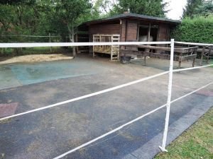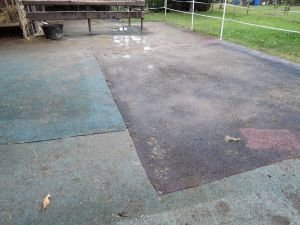 11. Jak a čím máte zpevněné povrchy kolem krmišť a před přístřešky?Jedinou velkou noční můrou pro nás bylo nezpevnění výběhu. Věděli jsme, že na tak malé ploše dojde k rozdupání a rozbahnění v takovém rozsahu, že koně nebudou moci v terénu chodit, nebude možné výběh kydat, bude docházet k promíchání bláta s výkaly, a tudíž budeme za chvíli stát na jednom velkém hnojišti. Proto mi dovolte se o tomto tématu rozepsat více: Nutnost řešit situaci se vyskytla samozřejmě velice brzy. Ulpívající bláto na kopytech bylo na gumovém povrchu tak kluzké, že by došlo ke zranění koně. Napadlo mne gumy před boxem pokrýt zátěžovými koberci a také okolí krmelce a cestu k němu, aby nás bláto nevyzouvalo z gumáků. Manžel měl sice námitky, ale nakonec musel sám uznat, že se vše osvědčilo. Proto jsem kontaktovala firmy, kde dělají pokládku koberců, aby mi nechali již použité koberce za odvoz. Pouze zátěžové! A pokládka pokračovala dál, až jsme jimi pokryli celý paddock ohrazený páskou – cca 20 x 10 m.