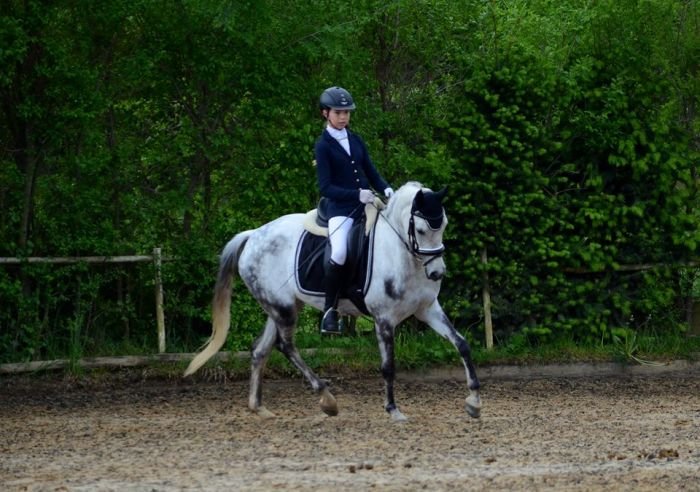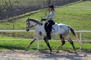 Nicméně jezdit máme víc zadkem než rukama, takže vzhůru k sedovým pomůckám. Nemusím (a nemám) na koni dřít, ale musím mu svým sedem „potvrzovat", co po něm chci. Nemůžu najet do cviku nebo chodu a čekat, že budu jen pasivně sedět a kůň ho bude dělat sám, stejně jako ho nemám tlačit každý krok. Je to přiložená holeň a zadek, který „rajtuje" a říká mu tak „pokračuj". Asi nejmarkantnější je to při zádržích, kdy chceme, aby se kůň shromáždil, zkrátil, ale zároveň zůstal v daném chodu a rytmu a pořád stejně aktivně šlapal. Ideální testík je kontracval nebo jednoduchá změna cvalu, kdy koně musíme připravit na přechod do kroku, ale zároveň nesmí dřív vypadnout do klusu. A tady jsem před pár týdny dostala geniální tip od své trenérky Daniely. „Mysli si, že dribluješ míčem o zem – tvůj zadek rytmicky odráží míč a pokud ten rytmus změníš, naruší se rytmus a míč upadne." Geniálně jednoduché a perfektně funkční… zejména když máte poníka s ne moc prostorným cvalovým skokem, cval opravdu připomíná driblování míče.