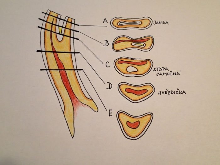 Jedná se o mělký žlábek nacházející se na labiální (tvářové) straně třetího řezáku. Je vyplněn cementem, a proto je jeho barva o něco tmavší. Začíná přibližně v polovině zubu a směřuje směrem ke kořenu. Proto se s ním poprvé setkáváme přibližně ve věku 9-10 let, do té doby je totiž ukryt v dásni. Ve věku 15 let dosahuje většinou poloviny klinické korunky a ve věku 20 let dosáhne okluzní plochy, takže je po celé délce klinické korunky. Pak se pomalu začne vytrácet směrem od dásně a ve věku 30 let zcela zmizí. Tohoto znaku se využívá po nejkratší dobu, byl popsán až na konci 19. století. Bohužel se opět nejedná o zcela jednoznačnou pomůcku pro odhad věku, jelikož se nemusí nacházet u velkého procenta koní.