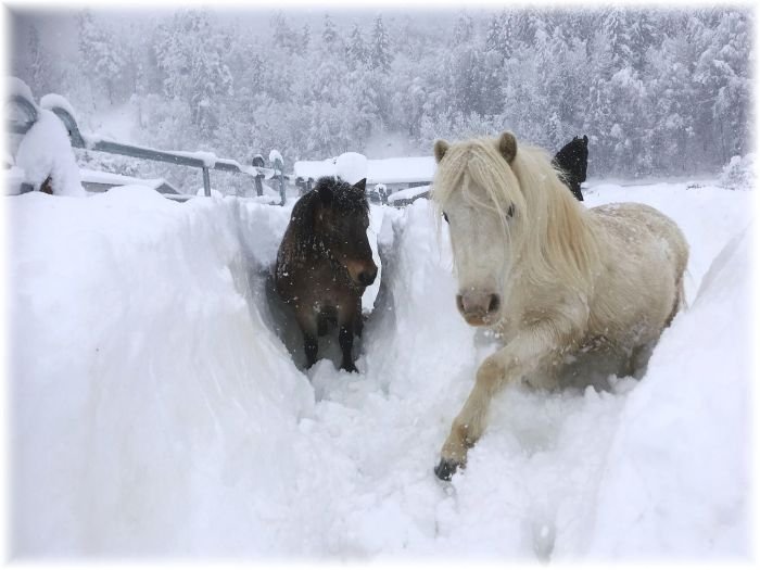 A že je Štědrý den? Co má být? O to dřív musíte vstát, abyste stíhali pozdější kolotoč kolem svátečních povinností doma, protože den se musí začít odházením sněhu kolem stájí a přístupových cest, nakrmením zvířat a rozbitím ledu v napájecích vanách na zimních výbězích, nanošením horké vody plus vykydáním boxů a přístřešků. I tak večer pojedete nanovo – opět krmení, napájení, úklid a kontrola zdravotního stavu, klidně v libovolném pořadí, ale v závěru musí proběhnout vše, mají-li být koníčkové spokojení a vy v klidu u stromečku (kde chvíli nepřítomně dumáte, jestli jste nenechali vánoční výzdobu stájí na dosah koním i s háčky a připínáčky).