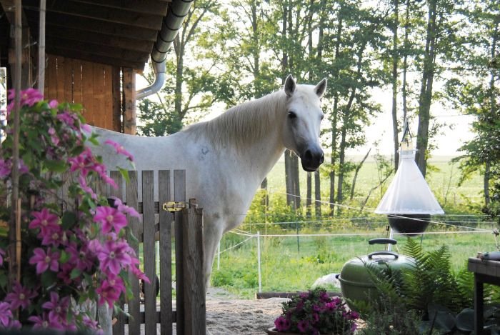 Hana: Koně si dávám na ustájko do spřátelené stáje několikrát do roka – hodně cestujeme. Ale mám jen tři nekonfliktní valášky menšího plemene, zvyklé být celoročně venku, tak se pro ně místo u ustajovatelů vždy najde. Zbytek roku si je rozmazluji doma, baví mě to tak moc, že jsem jim zpřístupnila i část okrasné zahrady, kde jsme vybudovali zpevněné treky. Tyto koňské cesty jsem obklopila květinami a zeleninou, ovocnými stromy, skalkami – je to krásné, každá návštěva je překvapena, jak pěkně to působí. A mě samotnou uspokojuje, že jsem dokázala, na rozdíl od manželových černých proroctví, propojit koňské plochy s plochami pro rodinu do jednoho estetického celku bez toho, že bych smradem a nevzhledností obtěžovala celou vesnici. Ale dá to strašné denní honičky, musí být čisto stabilně, už kvůli sousedům – bobky sbírám dvakrát denně děj se co děj, někdy i třikrát, hrabu a zametám, obzvláště při větrech je nárazově mnohem více starání o prostory přilehlé ke koňským cestám a k části velkého pastevního výběhu. Ale když vás to baví a pomáhá celá rodina, dá se zvládat strašně moc, dokonce i jezdit na vandry nebo si v zimě zajet na halu zaskákat.
