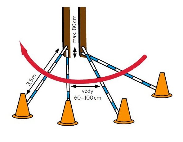 Kůň má pozorně a opatrně přejít vějířem ze čtyř tyčí, aniž by se jich dotkl.