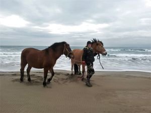 JuJu nám pomohla při společné vyjížďce po pláži odnaučit koníky strachu z mořských vln. S Blondiem zavedla naše koně do vody. My jí zas na oplátku naučili couvání a k velké radosti její mámy i bezpečnostní zastavení pomocí jedné otěže.