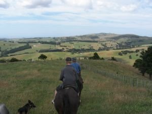 Na kopci s hezkým rozhledem na okolní krajinu plnou pastvin a stromů Kauri si děláme pauzu. Povídáme si s našimi průvodci o naší zemi, o koních a dalších zajímavých věcech. Mimo jiné se dozvídáme, že k moři se nejede, protože to se za půldenní track nedá zvládnout. Jen škoda, že to neřekli předem, bývali bychom si klidně zaplatili track celodenní.. Jsme trošku zklamaní, ale náladu si tím kazit nenecháme.