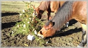 • Ještě jeden nápad na stromeček přímo ve výběhu mne zaujal: Větve borovic a smrků vyskládané přímo na sníh do tvaru velkého stromu. Proložit jablky, mrkví, sušeným pečivem, klidně i nasypat místy trošky ovsa. A můžete zavolat z pastvin koně!