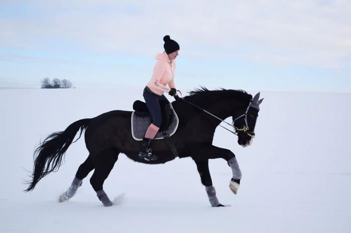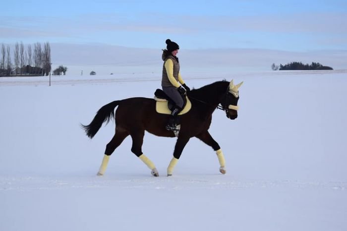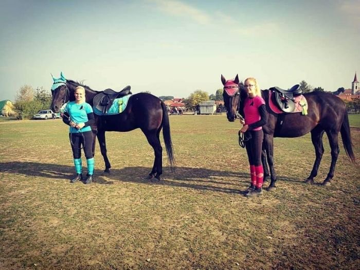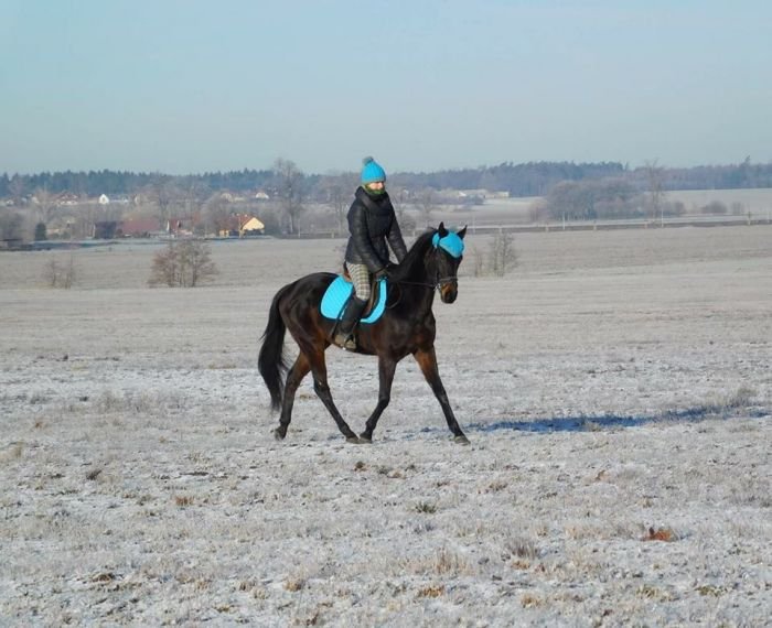 Co se týče modré, ta rozhodně k vraníkům jde, a opět platí, že čím světlejší, tím lepší, na odstínu zase tolik nesejde. A tahle kombinace stejné čepice pro koně i jezdce je velmi povedená.:-)