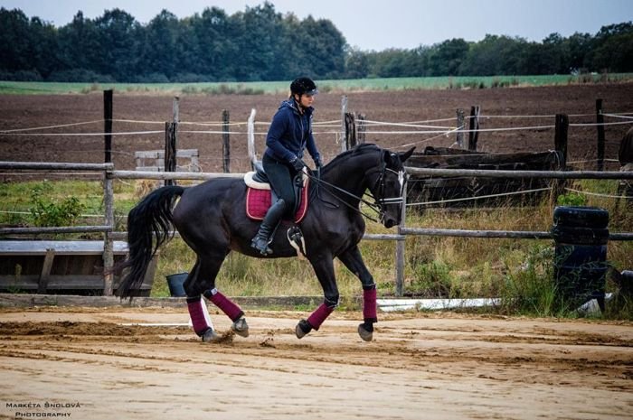 Když už jsme u těch odstínů příbuzných červené, trochu na hranici viditelnosti je i nachová – na této fotografii můžete porovnat, která barva na černém koni víc vynikne – zda kontrastnější tyrkysová, nebo nachová. Určitě ale o ní nelze říct, že by k tmavému koni neladila.