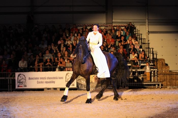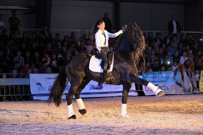 Časem se k Černýskovi přikoupil další fríský miláček, valach jménem Arnoldus T. Arnoldus se narodil v roce 2008, otec: Brend 413 (Stb Sport), matka: Vlaska (Stb Ster), a i on jezdil jak závodně drezuru, tak i show. Arnoldus T. se na výstavě Kůň v Lysé a na noční Galashow poprvé prezentoval 2013. A zase to neskončilo jen u toho jednoho ročníku! 🙂 V Lysé Arnoldus vystupoval i v letech 2015, 2016, 2017, 2018, na Mezinárodní výstavě Propet Brno v letech 2015 a 2017, na výstavě Koně v akci v Pardubicích v letech 2015, 2016… Do show jsem později zapojila i mého německého ovčáka Gulivera. 🙂