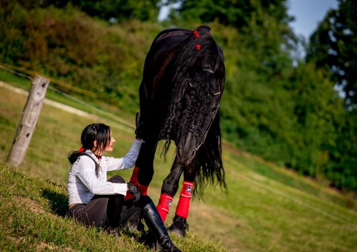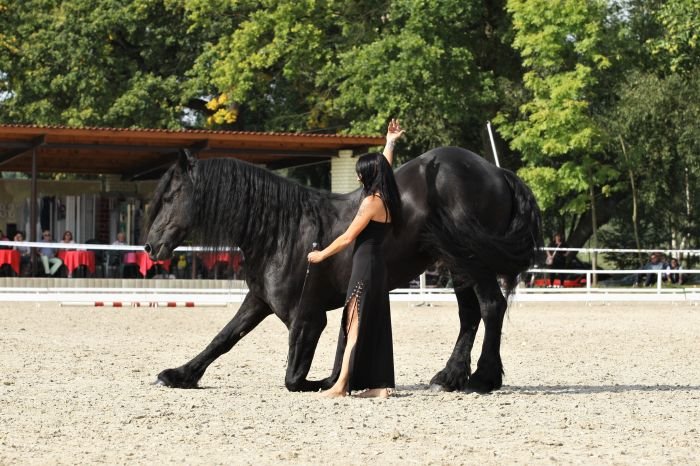 Tajfun se narodil v roce 2014 (otec: Willemke C. (Vb Ster), matka: Atsje (Stb)). Koupila jsem ho v roce 2019 z drezurní stáje ze zámku Moszna a ještě v témže roce jsme spolu vystupovali v Lysé nad Labem. Je radost s ním pracovat. Jeho temperament a krásné chody jsou samozřejmě dány i geneticky, což v Tajfunově rodokmenu zajistila známá jména fríských plemenných TOP hřebců, jako je například Jasper 366 a Beart 411. Máme spolu úžasný vztah, jsme na sobě opravdoví závisláčci! 🙂 Důvěra, kterou mezi sebou máme, je a bude hlavním motivem. Tak to ale bylo a je vždy u všech mých zvířátek… 🙂