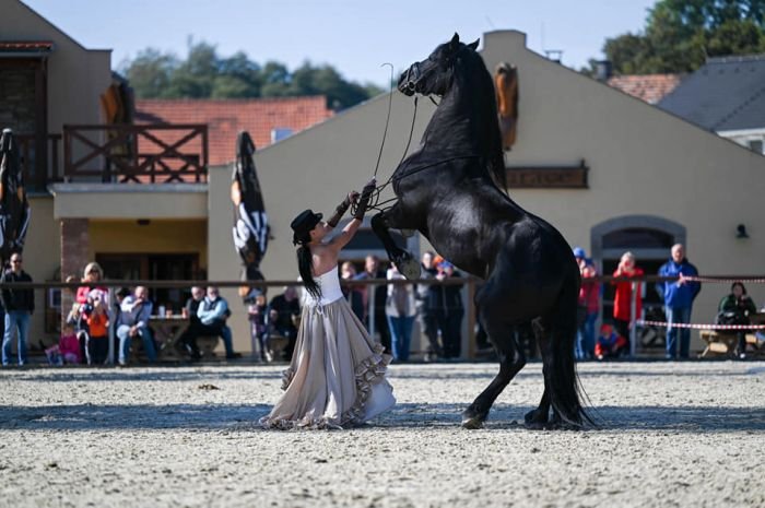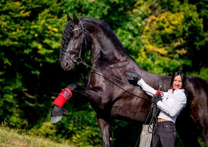 Kam mi paměť sahá, bylo mým snem vlastnit velkého černého koně. A sny jsou od toho, aby se plnily! 🙂 Volba proto tak nějak přirozeně padla na fríského koně. S frískými koňmi se mi pracuje skvěle, mají úžasný charakter. Je s nimi opravdu úžasná práce. Jsou nesmírně učenliví a ochotní pracovat. Každý má své oblíbené plemeno, na které nedá dopustit, pro mě je to fríský kůň.