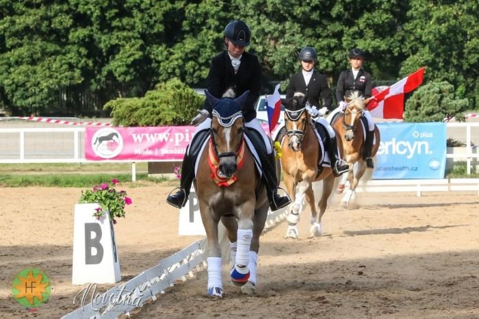 Nejen na mezinárodních šampionátech haflingů u nás, ale i na mistrovství Evropy je stabilně největší zájem o účast v drezurních soutěžích. V pátek se celé odpoledne jely tři soutěže – zahájení patřilo úloze Z1, aby se mohli koně i jezdci rozkoukat a ve větším klidu nastoupit do následujících soutěží, které už byly prvními koly šampionátu. Toho využilo celkem 16 jezdců, z nichž nejlepší hodnocení přes 72 % dostala zkušená slovenská dvojice – Michaela Balážová s klisnou Gajlu, která ve své zemi dosáhla například na dva juniorské tituly v drezuře. Další dva nejlepší výkony byly jen těsně pod 70 % a oba jsme viděli v podání rakouských jezdkyň – bílou kokardu si z večerního dekorování odnášela Doris Huber soutěžící s valachem Nova Rock, červenou za třetí místo pak Veronika Leddihn-Kühnelt s klisnou Finesse Du Coer. Nejlepší z českých dvojic byla čtvrtá Kateřina Ježková s valachem Aprilem a páté místo pak obsadila opět slovenská dvojice Júlia Martyneková a Ninus.