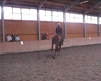 Dovnitř záď ve cvalu – hodnocení „velmi dobře, tak je to správně“, na videu však vidím a pod sedlem jsem cítila, že nebylo nic. Otázkou je, jestli byl ten správný čas pro tento cvik, protože jsem měla problém ve cvalu samotném – nemohla jsem koně dostat vpřed do potřebného cvalu na holeň.