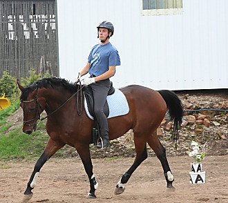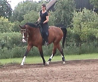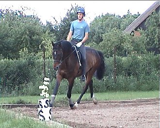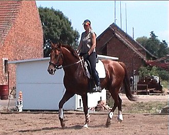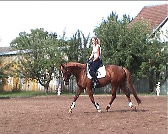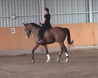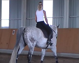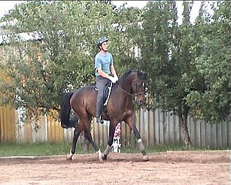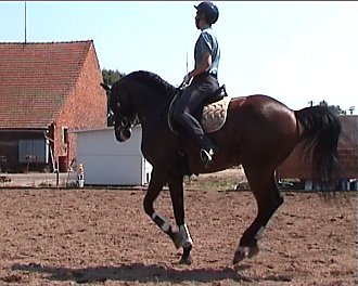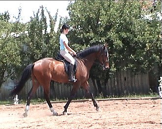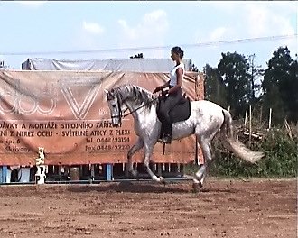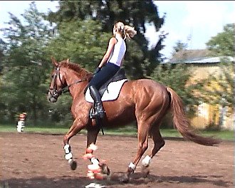 Práce v kroku se zlepšila, jsi schopná sama s ním pracovat a kůň je kulatější. Kůň není jednoduchý na ježdění, ale může velmi dobře fungovat, ale musíš najít cvičení, které ho zkulturní. Ve cvalu hledej ten samý kontakt, jako máš v klusu. Nechej ho jít, aby byl extra kulatý, kulatý musí zůstat i před a při nacválání. Jakmile se začne kulatit, prodluž otěž, a dej mu možnost být kulatý. Jakmile začne zvedat hlavu, tak se narovnej a pobídni ho vnitřní holení. Když se díváš dolů, kulatí se ti ramena, nesedíš rovně a kůň začne tuhnout. Lehký kontakt, stejný v obou otěžích, nenechávej mu v pravé větší. Obtoč holeně kolem něho a aktivizuj ho tak, aby dal hlavu dolů a zvedl záda, neustále to po něm požaduj, stále musíš cítit spojení mezi holení, sedem a hubou, i v zastavení. Pochval ho a víc s ním komunikuj, aby pochopil, kdy to dělá správně. Při zastavení mu nechej běžet motor. Když mu přestane proudit energie tělem tak jak má, tak zvedne prostě hlavu. Při vykročení musí zůstat v požadované pozici.