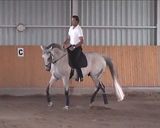 Musíš najít ten správný moment, kdy chceš požádat o změnu cviku. Kůň je začátečník, tak ty musíš vycítit, kdy změnu můžeš chtít, tj. když děláš překrok ve cvalu na střední čáru a pak chceš vyjet rovně, musíš přestat dávat pobídku v pravý moment.