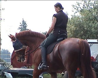 Když se na kruhu podívá ven, ťukni vnější holení, klisna zpozorní a srovná se. Před cváláním je třeba ji pomocí cviků (plec vpřed x ustupování na holeň, kroužek..) uvolnit a vybalancovat, jinak s tebou bude hned utíkat. Snaž se uklidnit obě ruce, hlavně vnitřní.