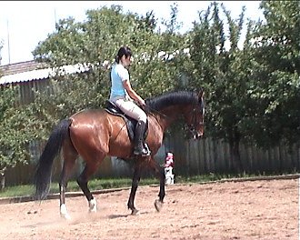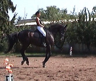 Pěkné provedení přeskoku, z poloviční piruety znovu nacválání, v podsazení přeskok, na obě ruce.Je-li zpočátku v tenzi a spěchá, dělej plece, kůň se začne soustředit a pracovat v přiměřeném tempu.