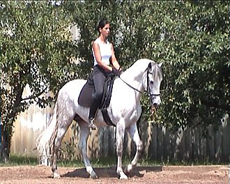 Je třeba, aby šel níž s krkem a zůstal kulatý. Kůň je připraven pro intenzívnější práci. Vem si ho na přilnutí, otěžemi ho zarámuj, sedem komprimuj energii a dovol mu ji vypustit dopředu. Tuto práci dělej vždy krátce, abys nepřekročila jeho možnosti a aby byla vykonána od začátku precizně. Vnější otěž musí mít kontakt, dávej na to pozor.