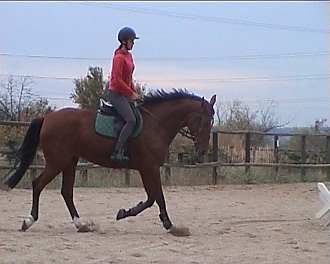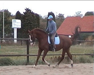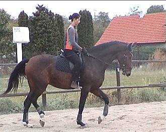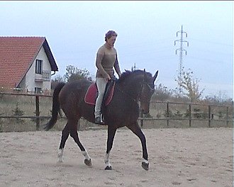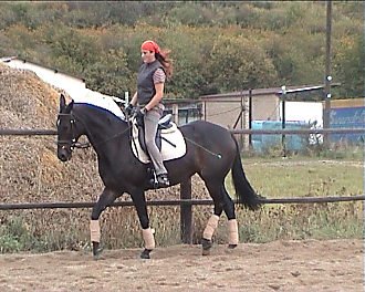 Vlaďka Cermanová – Corlandus: stále dokola – nedívej se dolů, seď rovně a v koni. Jakmile získáš spojení mezi vnitřní nohou a vnější otěží, musíš cítit v obou rukou koně stejně. Přechody v uvolnění bez změny postavení (vnitřní noha, sed). Pozor, aby při dovnitř plec na kruhu kůň nevybočoval ven. Vnější holeň za podbřišník. Aktivizuj ho dopředu. V obratech nabídni vnitřní otěž. Kůň je na velmi dobré cestě, pokračuj tak dál.