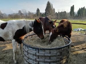 Naopak použití speciálních krmných sítí, které se přetahují přes balík cíleně na krmení, je velmi vhodné (ale vždy odstranit obvodovou síť balíku, nenechávat ji pod krmnou sítí!). Ideální je umístění do krmelců a zabezpečení volných stahovacích konců, aby se do nich koně nezamotali. Dále u pastevního ustájení bych jako rizikový faktor viděla napájecí vodu – zde častěji hrozí její nedostatek v zimě (z důvodu zamrzání) a je potřeba toto hlídat. A jelikož jsem zastáncem každodenního doplňování denní potřeby vitamínů a minerálů kompletní vybalancovanou směsí, upozornila bych také na nutnost v „pastevku“ zajistit individuální podávání doplňků a příkrmů dle potřeby jednotlivých koní.