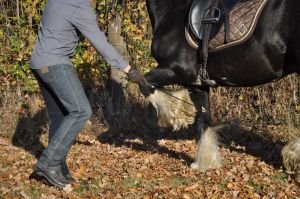 V úvodu se postavíme na tu stranu koně, na níž chceme zvednout nohu. Zkontrolujte, zda na noze, kterou chcete zvednout, nestojí kůň plnou vahou. Pokud ano, lehkým tlakem na plec jeho těžiště přesuňte na opačnou přední končetinu. Následně klepněte tušírkou (spíše polechtejte, než švihněte!) na nohu a pokud kůň nohu zvedne, nadšeně ho odměňte. Přesné místo, kde má bič působit, je detektivní příběh. Metodou pokus omyl musíte najít místo, kde kůň na dotyk nejlépe reaguje.