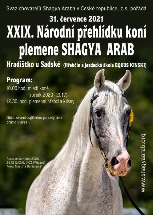 XXIX. Národní přehlídka koní plemene shagya arab se koná v sobotu 31. července 2021 od 10:00 v areálu Jezdecké školy Equus Kinsky – Hradištko u Sadské 126, 289 12.