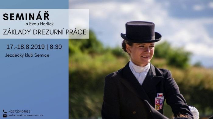 Zajímáte se o drezúrní práci, která je alfou a omegou jezdectví? Chcete se vzdělávat podle klasických a akademických principů? Pak jste zváni na dvoudenní seminář s Evou Horlick pořádaný ve dnech 17. a 18. srpna v Jezdeckém klubu Semice.