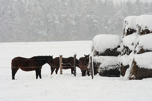 Ve sněhu, pod nímž číhalo bahno, se individuální koně kontrolovali velmi těžko, ale přesto jsme se za klisnou vypravili do výběhu. Bohužel jsme museli konstatovat, že její kondiční stav se vůbec nezlepšil. Propadlé slabiny svědčily o tom, že ač je ve výběhu balík sena, klisna není nakrmená. Navíc ve stádě nevypadala spokojeně a nenašli jsme ji u sena, nýbrž v rohu, vyhrabávající zpod sněhu starou trávu. Toto nás přivedlo k úvahám, jestli nebude problém způsoben její nízkou pozicí ve stádě. Je-li dominantnějšími kolegy odháněna, pravděpodobně se nemůže nasytit jak by potřebovala. Doufejme, že individuální péče v jejím případě se neomezí jen na dekování.